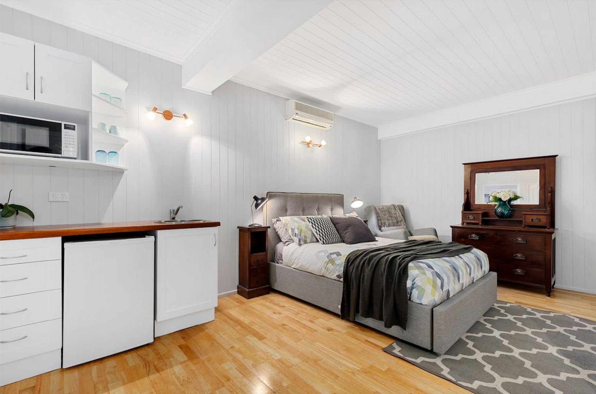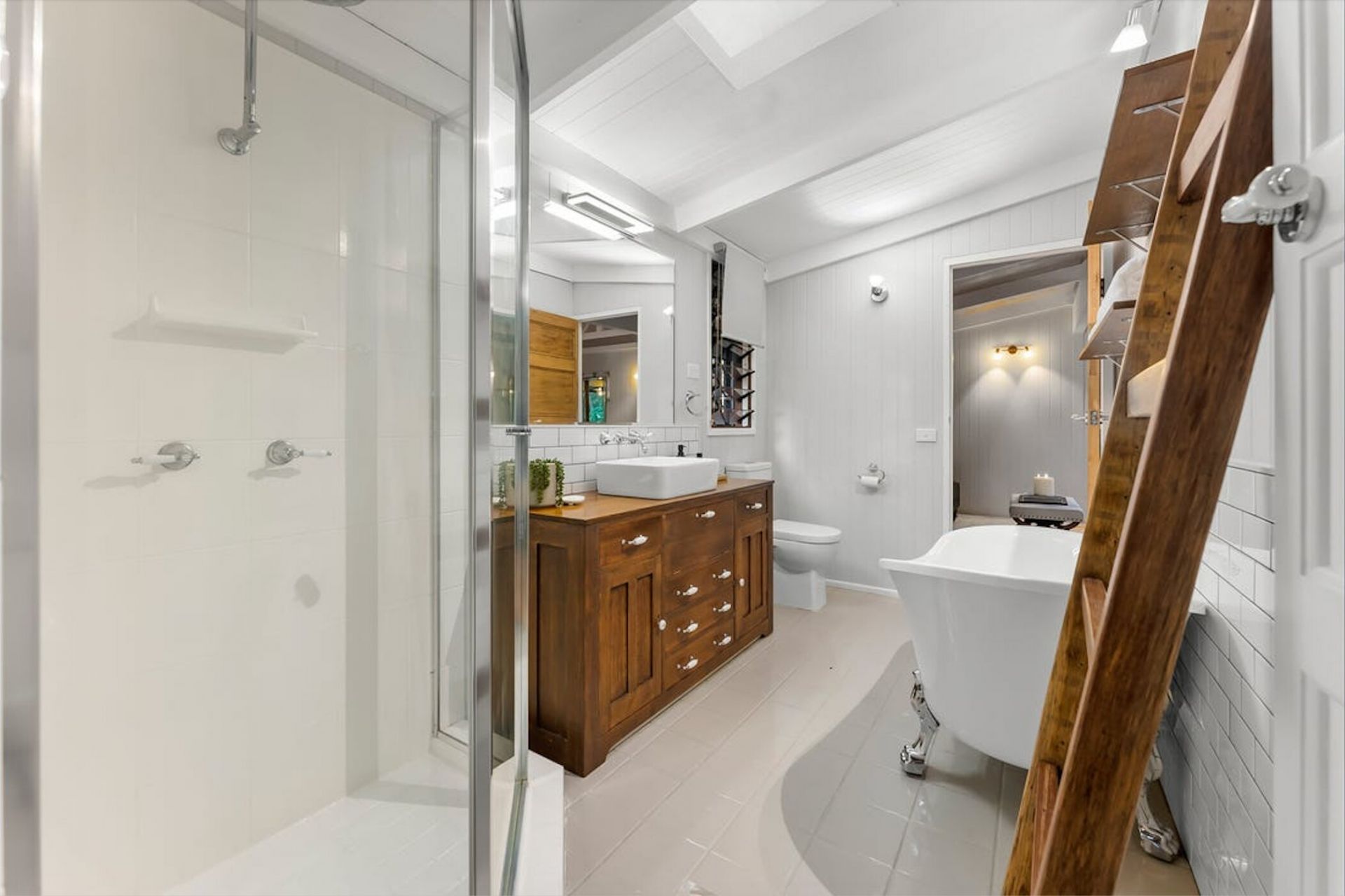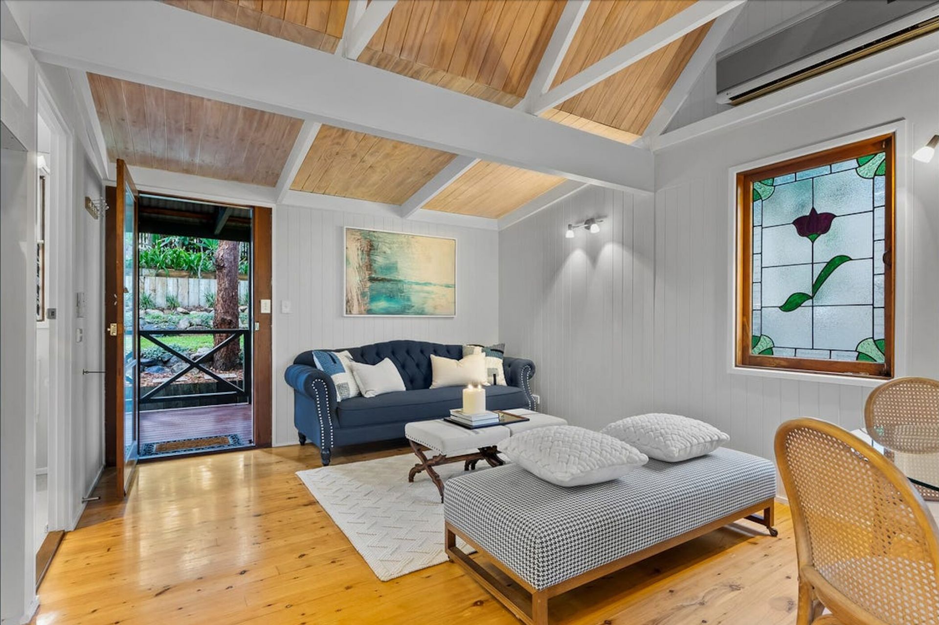 Spanning two levels, this residence exudes character with its stained glass windows, raked ceilings, exposed beams, and timber floors throughout. The well-appointed kitchen features a stone benchtop, gas cooking, and ample storage—ideal for preparing meals while enjoying the green scenery and the soothing sounds of birdsong at the end of the day.