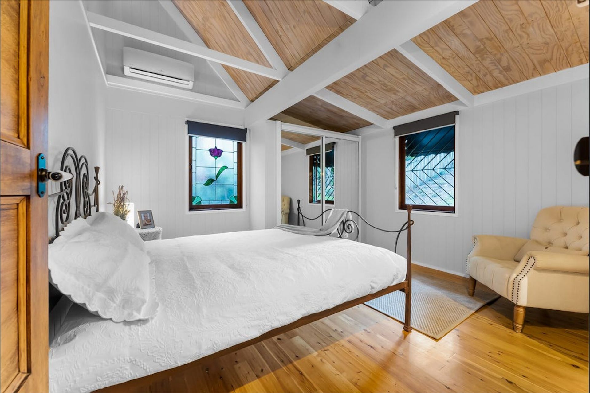 Upstairs, the two bedrooms continue the home’s character with raked ceilings, stained glass windows, and exposed beams. Both rooms are equipped with air conditioning to ensure comfort during the hot summer months.