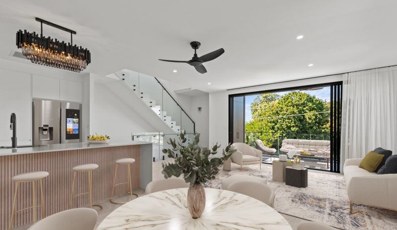 The open-plan living and dining areas flow effortlessly to an alfresco balcony, while the gourmet kitchen, complete with Smeg appliances and a breakfast bar, invites relaxed meals and conversation. Additionally, the property boasts an extra living room downstairs, providing flexible space for family gatherings or a quiet retreat.