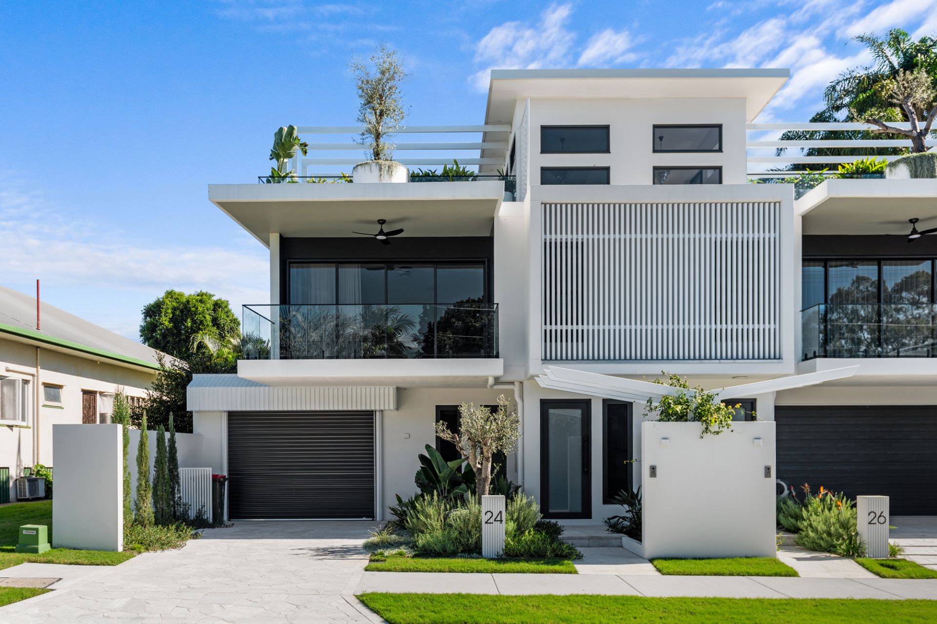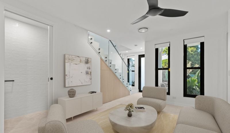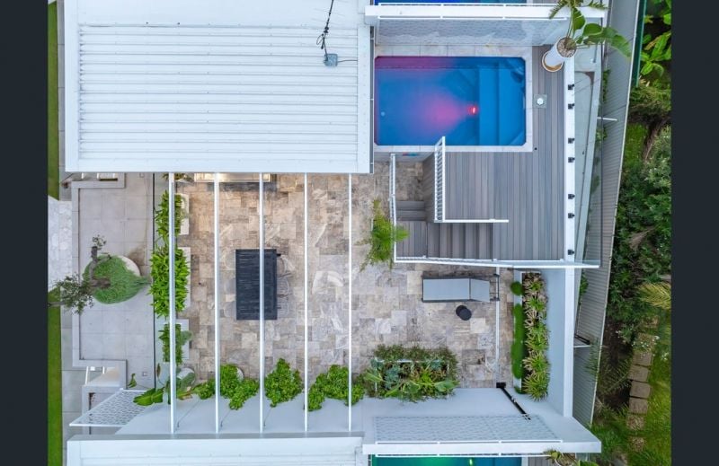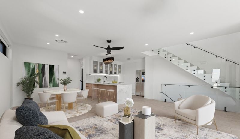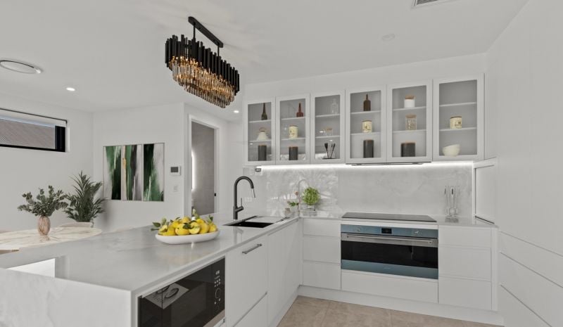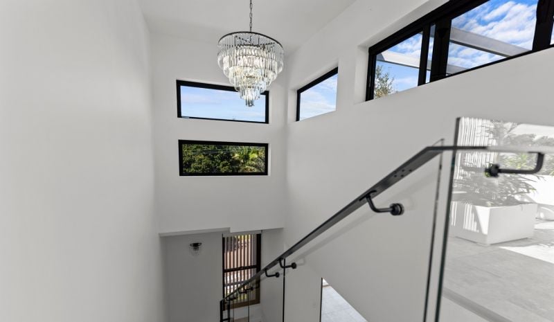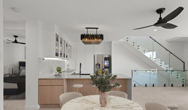 Enter a sanctuary of refined living, where a striking white aesthetic harmonizes with lush, landscaped gardens and high-end finishes. Travertine tiles, stone benchtops, and soaring ceilings create an ambiance of modern elegance.