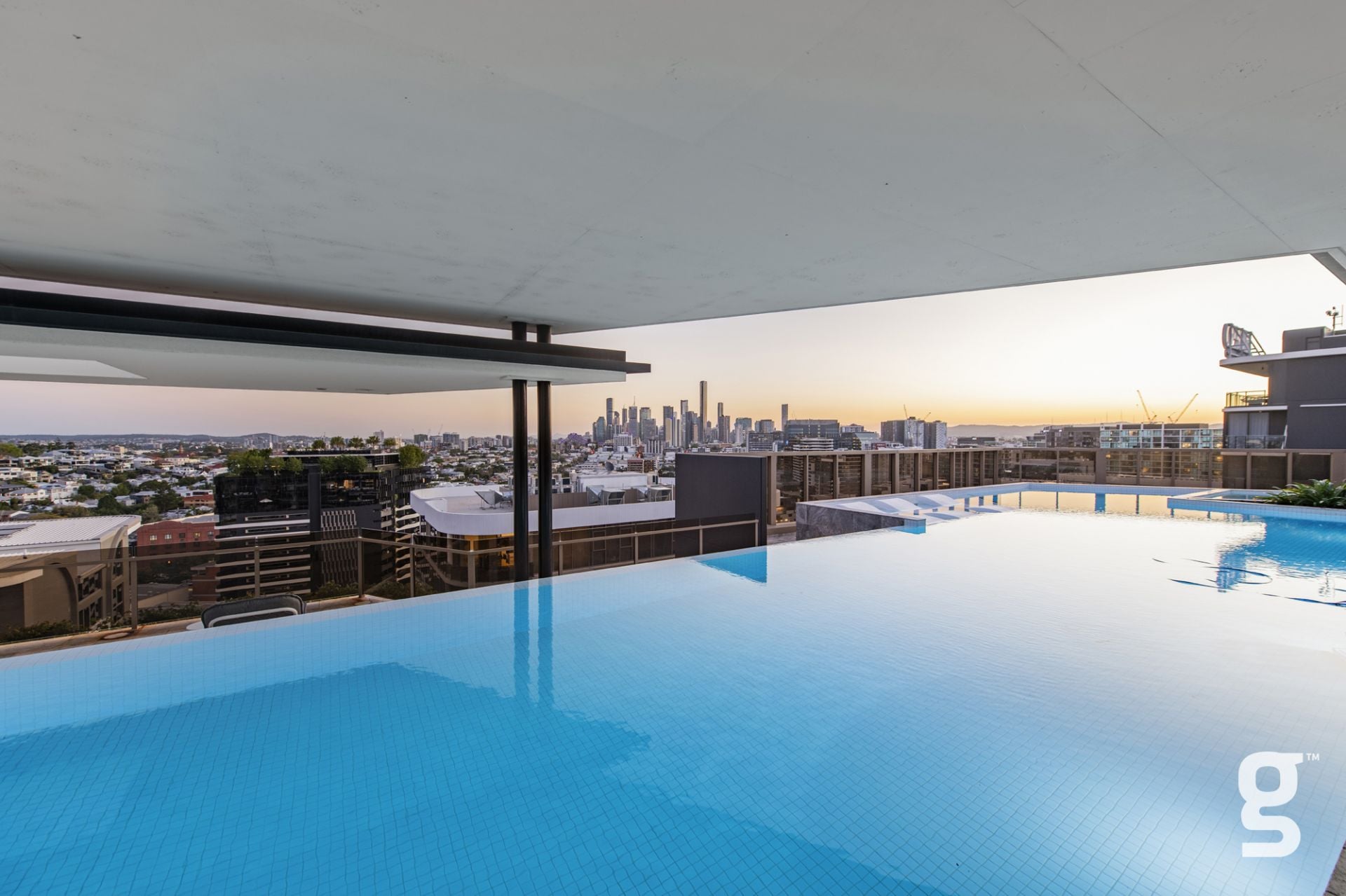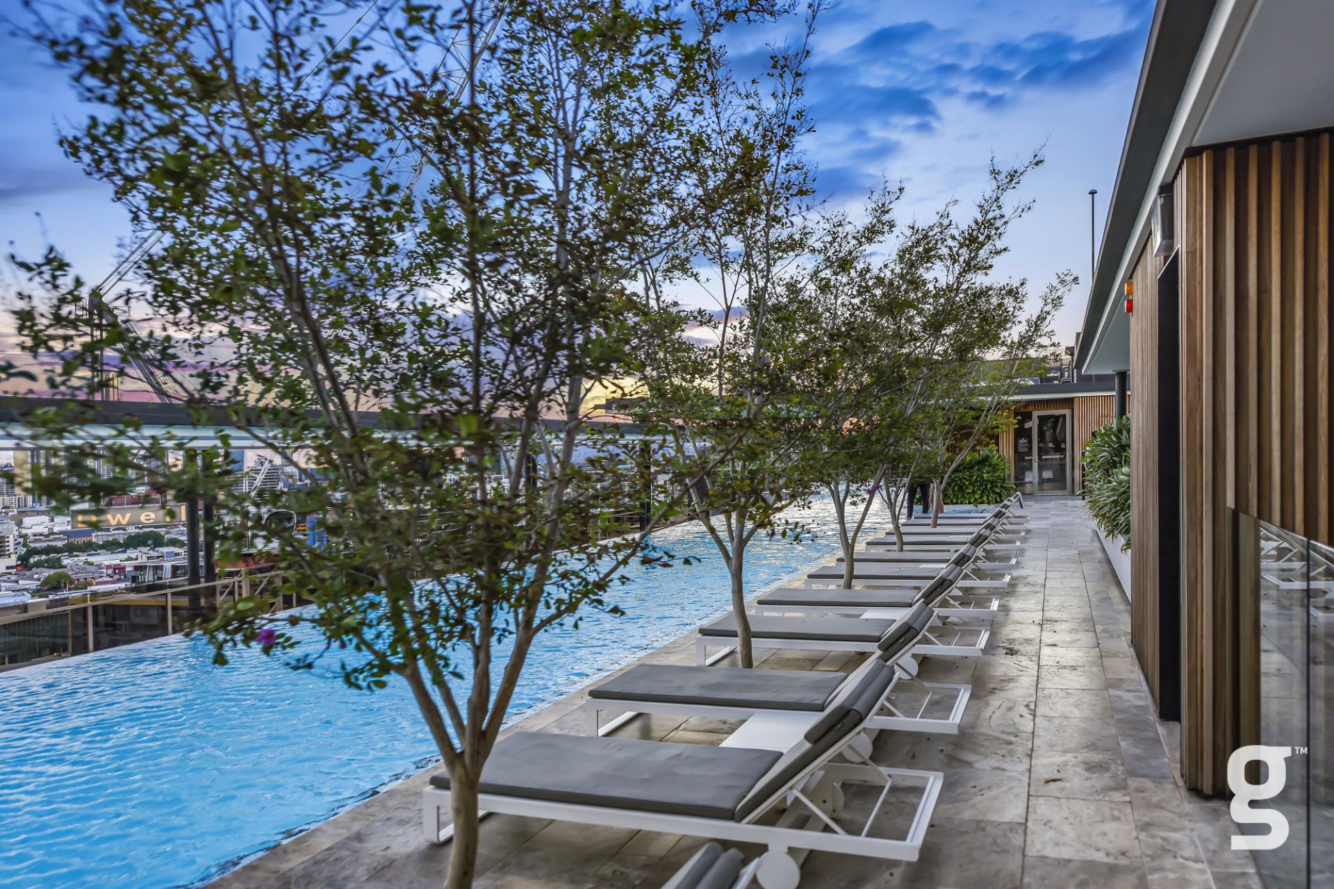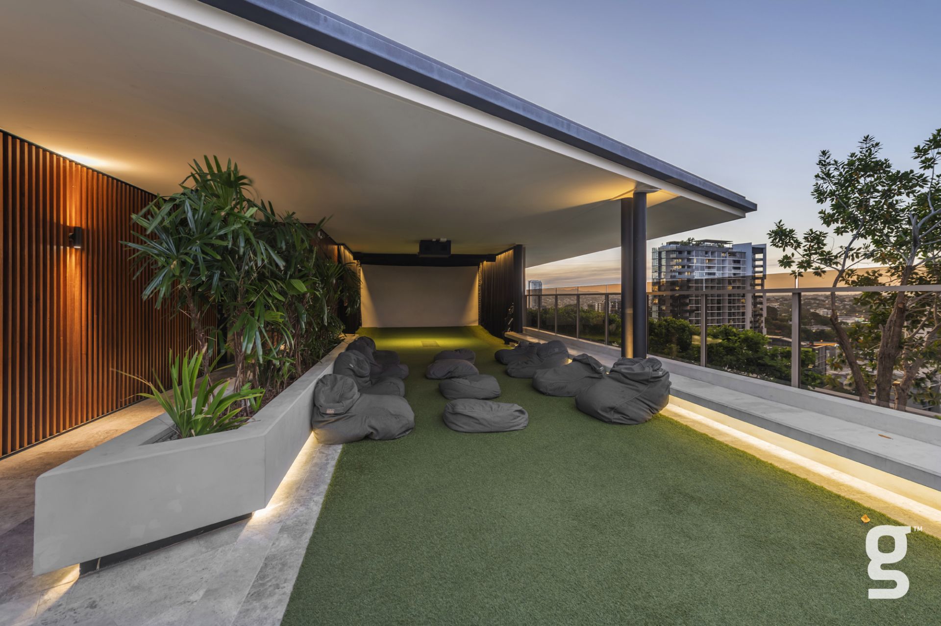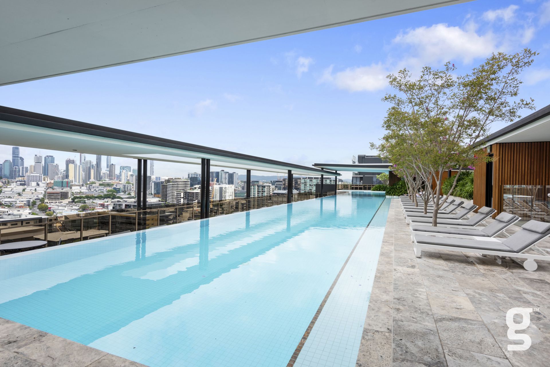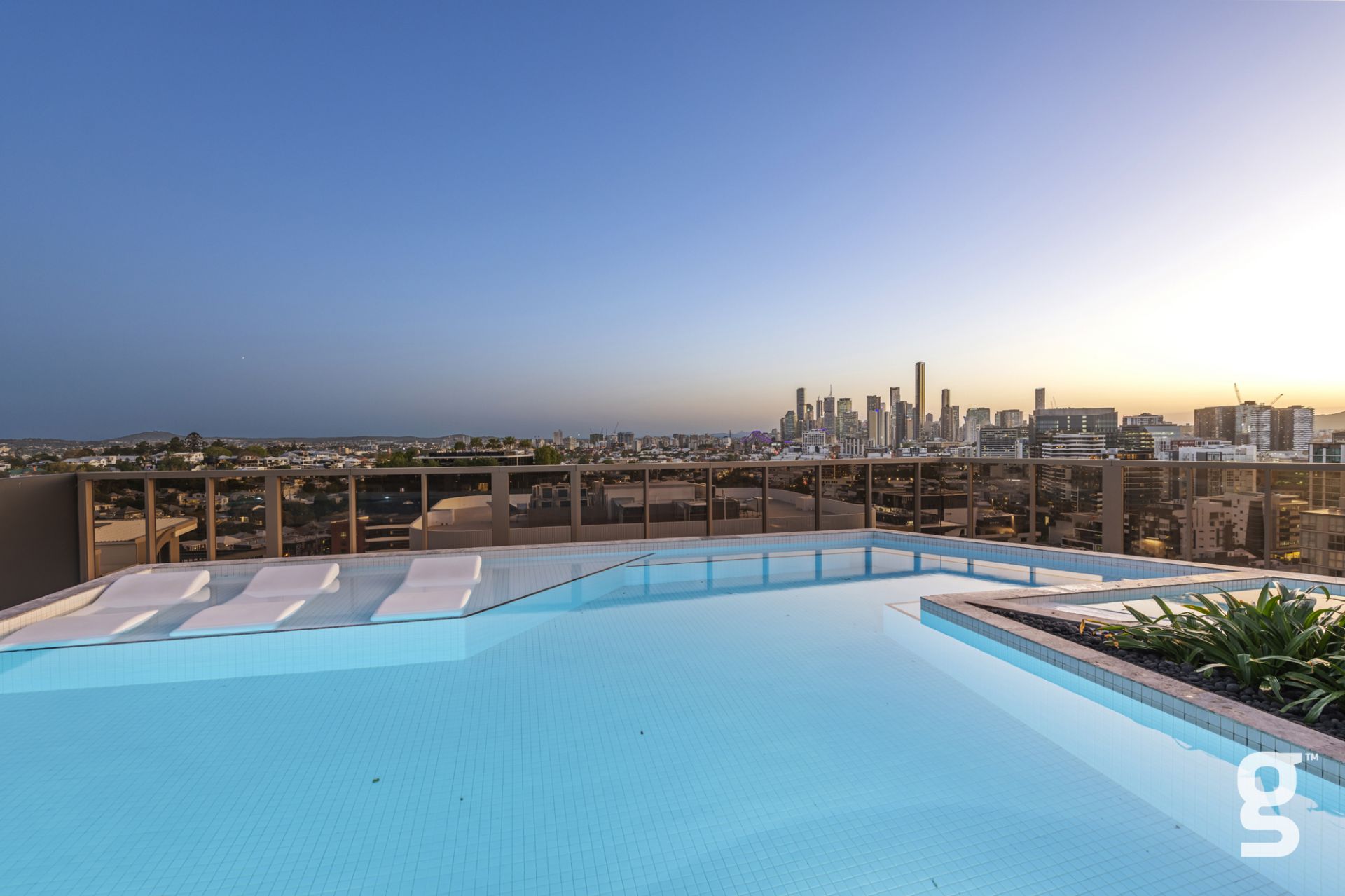 Lucent Gasworks is a 17-storey residential tower designed to opitomize Brisbane’s health and wellness, contemporary lifestyle. This architectural landmark offers an array of luxury amenities and exclusive services, including a private 1600sqm rooftop oasis. The exclusive rooftop amenities include a 55m infinity pool with underwater speakers, a heated sunset spa, and a waterfall deck. For relaxation and wellness, there is a sauna with floor-to-ceiling glazing and panoramic city views. The private dining room is available for event bookings, and the entertainment options include a golf simulator with over 170 virtual courses. The fitness center is equipped with state-of-the-art Technogym equipment, including Pilates reformers, a skillmill, and a yoga deck. The rooftop retreat offers an entertaining area complete with a Teppanyaki Bar and multiple relaxation areas.