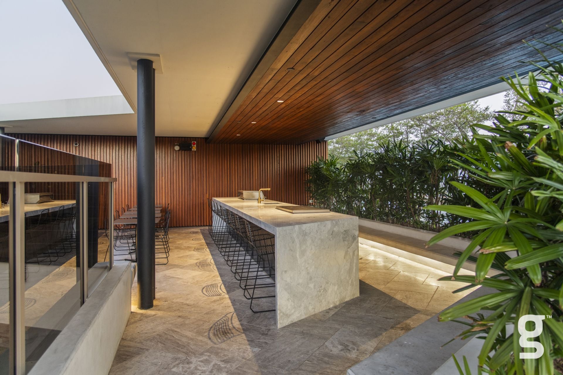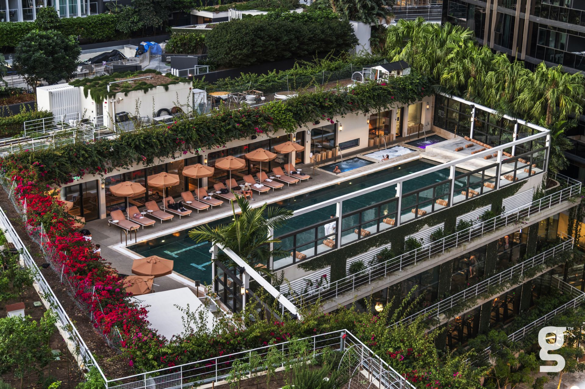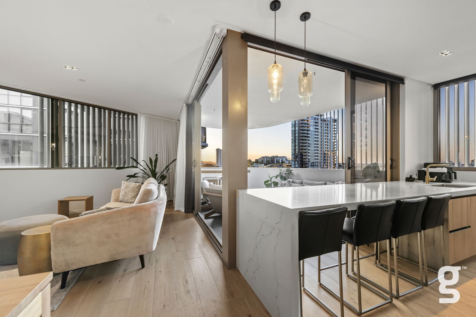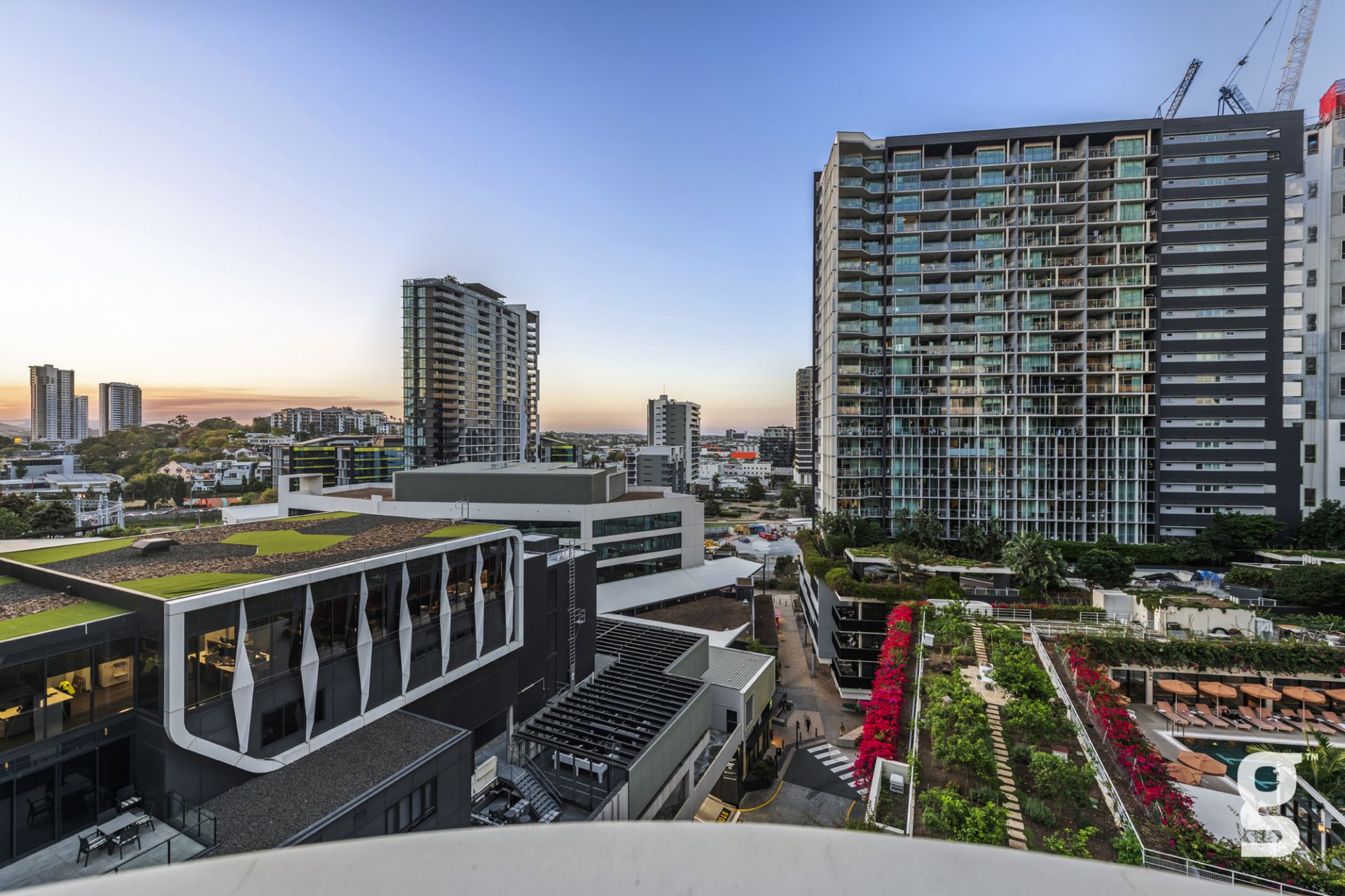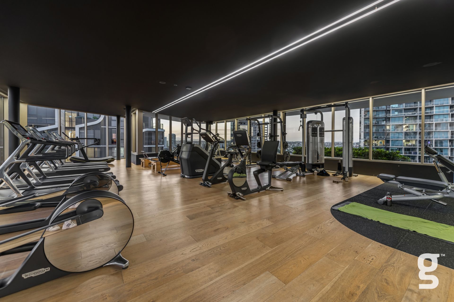 Lucent Gasworks is a 17-storey residential tower designed to opitomize Brisbane’s health and wellness, contemporary lifestyle. This architectural landmark offers an array of luxury amenities and exclusive services, including a private 1600sqm rooftop oasis. The exclusive rooftop amenities include a 55m infinity pool with underwater speakers, a heated sunset spa, and a waterfall deck. For relaxation and wellness, there is a sauna with floor-to-ceiling glazing and panoramic city views. The private dining room is available for event bookings, and the entertainment options include a golf simulator with over 170 virtual courses. The fitness center is equipped with state-of-the-art Technogym equipment, including Pilates reformers, a skillmill, and a yoga deck. The rooftop retreat offers an entertaining area complete with a Teppanyaki Bar and multiple relaxation areas.